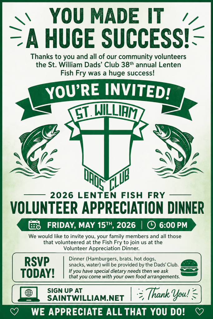Welcome to the St. William Dads’ Club website! Your source for all things related to Athletics, Events and more!